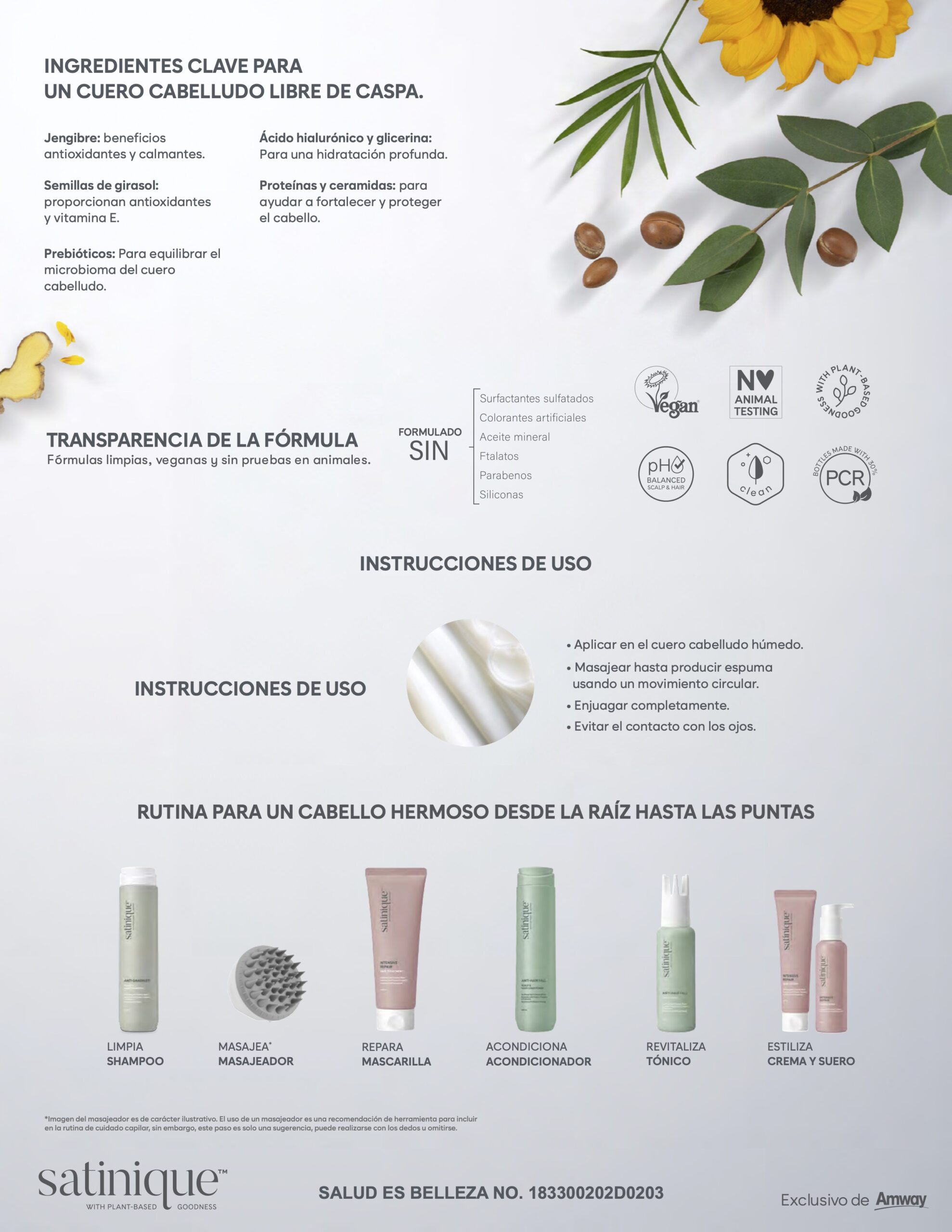 • Con Patente fitoliposomas para el cuero cabelludo: para ayudar a equilibrar la humedad y mantener la barrera de hidratación del cuero cabelludo.