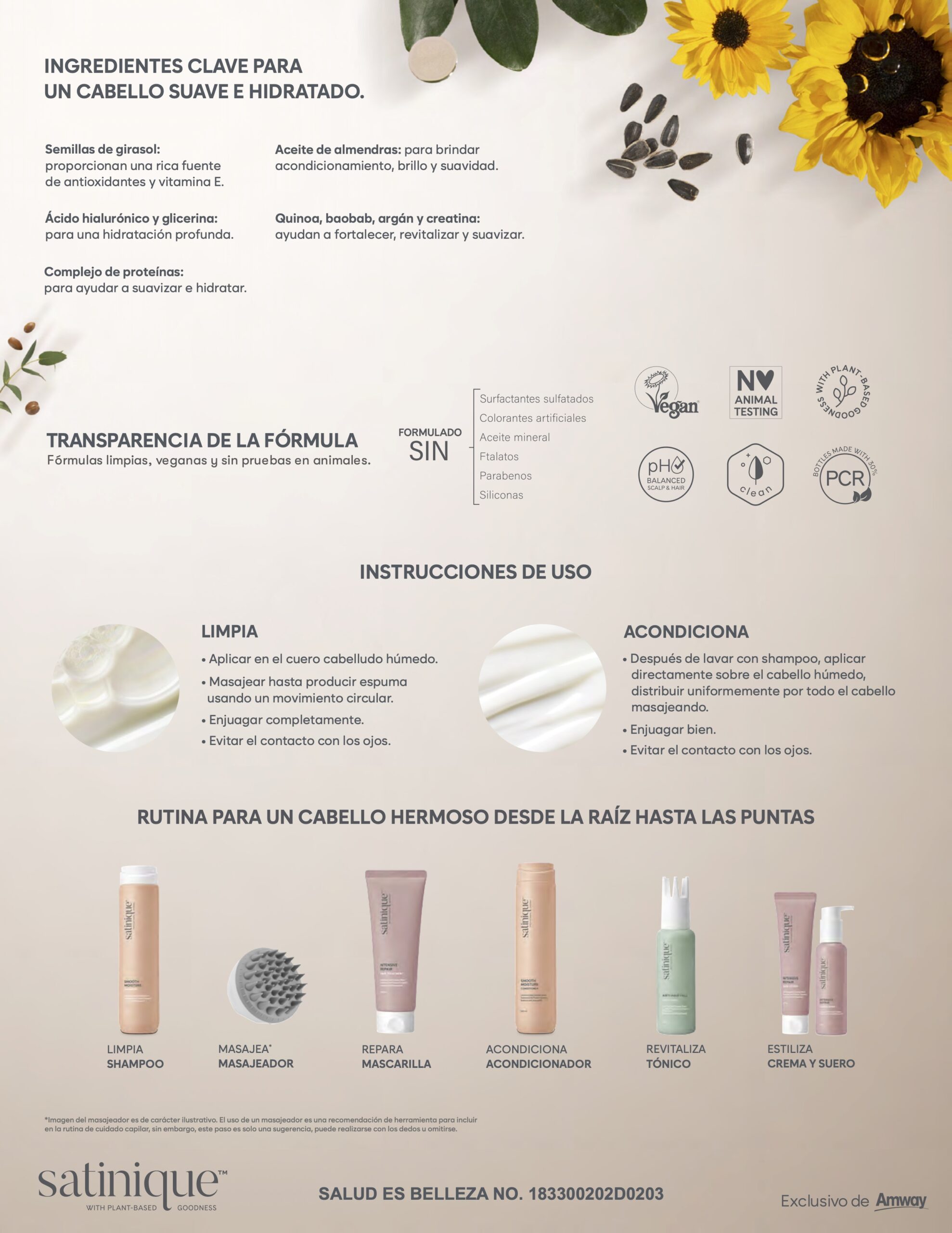 Fórmula vegana enriquecida con proteínas que ayuda a mantener el cabello hidratado, sedoso y manejable desde la raíz hasta las puntas.